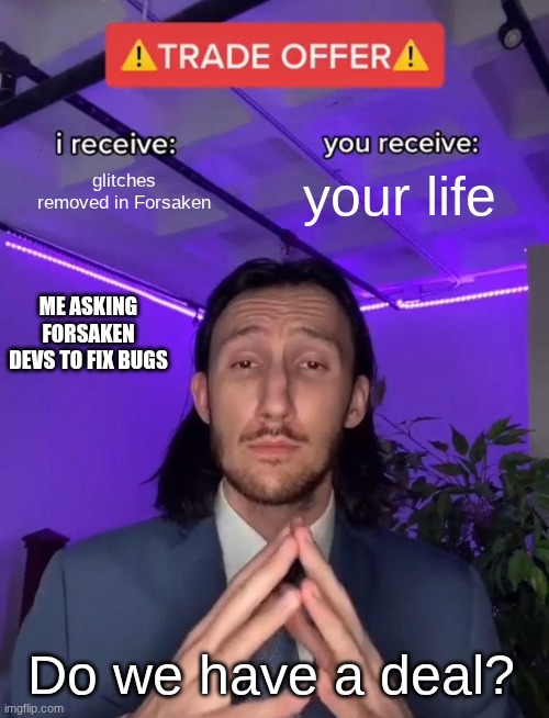glitches removed in Forsaken; your life; ME ASKING FORSAKEN DEVS TO FIX BUGS; Do we have a deal?