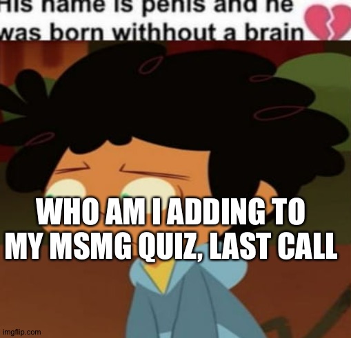 Camp camp | WHO AM I ADDING TO MY MSMG QUIZ, LAST CALL | image tagged in camp camp | made w/ Imgflip meme maker