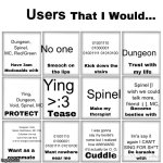 Dungeon, Spinel, MC, Red/Green No one 01001110 01000001 01001111 01010100 Dungeon I was gonna say my bestie's name but I realized how AWKWAR...