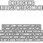 OK I DUCKING SERIOUSLY NEED SOME HELP IT'S NOT SOMETHING URGENT BUT STILL IF I DON'T GET TO THE BOTTOM OF THIS I MIGHT GO CRAZY, IF YOU'RE A...