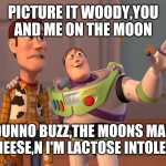 PICTURE IT WOODY,YOU AND ME ON THE MOON I DUNNO BUZZ,THE MOONS MADE OF CHEESE,N I'M LACTOSE INTOLERANT