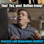 You! Yes, you! Define irony! Fascists call themselves Antifa!? Check out the big brain on Brett!