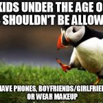 KIDS UNDER THE AGE OF 14 SHOULDN'T BE ALLOWED TO HAVE PHONES, BOYFRIENDS/GIRLFRIENDS, OR WEAR MAKEUP