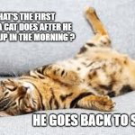 WHAT'S THE FIRST THING A CAT DOES AFTER HE WAKES UP IN THE MORNING ? HE GOES BACK TO SLEEP .
