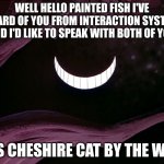WELL HELLO PAINTED FISH I'VE HEARD OF YOU FROM INTERACTION SYSTEM AND I'D LIKE TO SPEAK WITH BOTH OF YOU ITS CHESHIRE CAT BY THE WAY