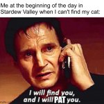 Me at the beginning of the day in Stardew Valley when I can't find my cat: PAT