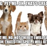 DOG: PET ME. OH, THAT'S GREAT!! CAT: PET ME. NO, NOT THERE!! I WILL SCRATCH YOU! HERE! OH, THAT'S THE SPOT...I WILL BITE YOU NOW.