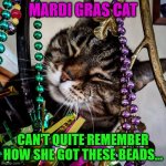 MARDI GRAS CAT CAN'T QUITE REMEMBER HOW SHE GOT THESE BEADS...