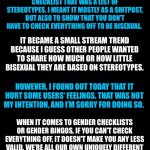 YESTERDAY, I POSTED A BISEXUAL CHECKLIST THAT WAS A LIST OF STEREOTYPES. I MEANT IT MOSTLY AS A SHITPOST, BUT ALSO TO SHOW THAT YOU DON’T HA...