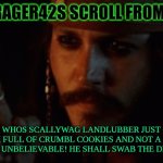MATEYS WHOS SCALLYWAG LANDLUBBER JUST CAME IN WITH A BOX FULL OF CRUMBL COOKIES AND NOT A CHEST FULL OF TREASURE! UNBELIEVABLE! HE SHALL SWA...