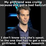 My girlfriend was crying because she got a bad haircut. I don’t know why she’s upset. I’m the one that has to get a new girlfriend. Antho...