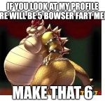 IF YOU LOOK AT MY PROFILE THERE WILL BE 5 BOWSER FART MEMES MAKE THAT 6