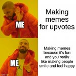 Making memes for upvotes Making memes because it's fun and you really like making people smile and feel happy ME ME