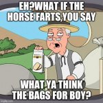 EH?WHAT IF THE HORSE FARTS,YOU SAY WHAT YA THINK THE BAGS FOR BOY?