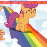 MAYBE I CAN'T FLY, BUT I CAN RIDE RAINBOWS! GET BACK HERE! WORK DOESN'T END TIL 3:30!