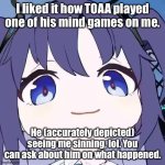 I liked it how TOAA played one of his mind games on me. He (accurately depicted) seeing me sinning, lol. You can ask about him on what happe...