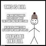 THIS IS BILL HE DOESN'T JUDGE PEOPLE BY WHAT THEY ARE ON THE OUTSIDE HE NEVER MAKES FUN OF UGLY OR SHORT PEOPLE PLEASE BE LIKE BILL