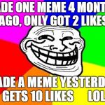MADE ONE MEME 4 MONTHS AGO, ONLY GOT 2 LIKES MADE A MEME YESTERDAY, GETS 10 LIKES LOL