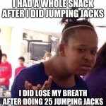I HAD A WHOLE SNACK AFTER I DID JUMPING JACKS I DID LOSE MY BREATH AFTER DOING 25 JUMPING JACKS