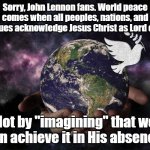 Sorry, John Lennon fans. World peace comes when all peoples, nations, and tongues acknowledge Jesus Christ as Lord of All. Not by "imagining...