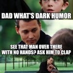 DAD WHAT'S DARK HUMOR SEE THAT MAN OVER THERE WITH NO HANDS? ASK HIM TO CLAP BUT DAD I'M BLIND