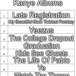 Kanye Albums Late Registration My Beautiful Dark Twisted Fantasy Yeezus The College Dropout Graduation Kids See Ghosts The Life Of Pablo Ye ...