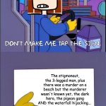 The stigmonaut, the 3-legged man, plus there was a murder on a beach but the murderer wasn't known yet, the dark hero, the pigeon gang AND t...