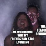 ME WONDERING WHY MY FRIENDS HAD STOP LAUGHING THE TEACHER BEHIND US