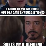 I ABOUT TO ASK MY CRUSH OUT TO A DATE. ANY SUGGESTIONS? SHE IS MY GIRLFRIEND