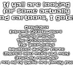 If yall are looking for some actually good cartoons, I gotchu: Ozzy&Drix Extreme Ghostbusters Smiling Friends The Groovenians The Boondocks...