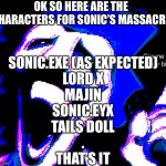 OK SO HERE ARE THE CHARACTERS FOR SONIC’S MASSACRE SONIC.EXE (AS EXPECTED) LORD X MAJIN SONIC.EYX TAILS DOLL . THAT’S IT