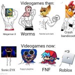 Videogames then: Videogames now: Megaman X Worms Ratchet and clank Crash bandicoot Sonic.EYX Poppy's playtime FNF Roblox