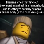 Therians when they find out they aren't an animal in a human body and that they're actually humans in a human body (who could have guessed)