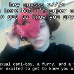 hey guysss >///< I'm new here but I'm super excited to get to know you guys I'm a pansexual demi-boy, a furry, and a therian >_< I'm super ...