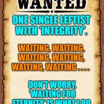 ONE SINGLE LEFTIST WITH 'INTEGRITY'. WAITING, WAITING, WAITING, WAITING, WAITING, WAITING . . . . DON'T WORRY, 'WAITING FOR ETERNITY' IS WHA...