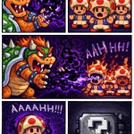 "One day the kingdom of the peaceful mushroom people was invaded by the Koopa, a tribe of turtles famous for their black magic. The quiet, peace-loving Mushroom People were turned into mere stones, bricks and even field horsehair plants, and the Mushroom Kingdom fell into ruin.
