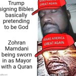 You didn't mind it when Trump basically pretended to be God but you are freaking out about Zohran Mamdani with a Quran