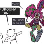 Most people refer to this character as just "Fukouna Girl", since that's the song they're on the cover of, but they are actually called Caroline + Stomach Book has made songs other than Fukouna Girl