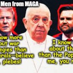 It's a picture about knowing more than the Pope. e have a different one now-- we will have a different one again in prob 15-20 years. We are talking about an institution. I wasn't about to go shopping for fifteen minutes for a better picture. Why don't you address Vance's ignorance instead, which is what the meme is about.